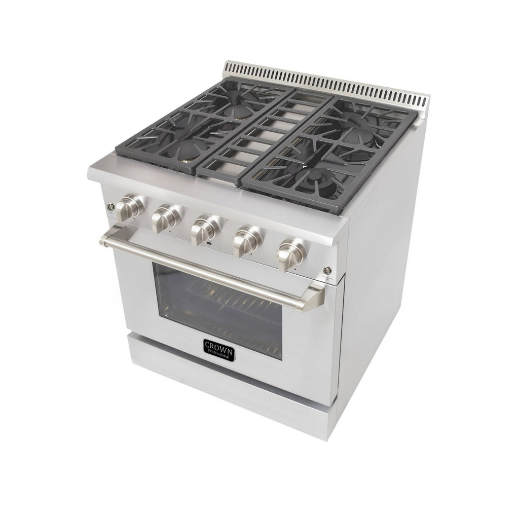 Crown Professional offers the power and performance of a premium professional appliance at a practical price. The 30 inches Crown Professional Dual Fuel Gas Range is a stainless-steel machine that is designed with professional features and functionality. This powerful dual fuel gas range has 4 burners including one 18,000 BTU burner, one 15,000 BTU dual burner with simmer and two 12,000 BTU burners giving you the flexible cooktop you’ve been dreaming about.