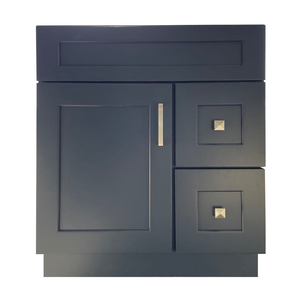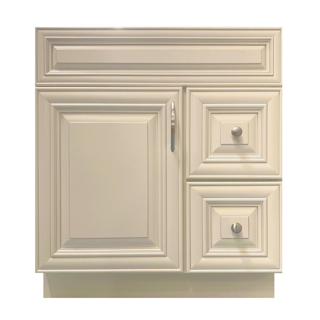 The 30 inch Solid Wood Bathroom Vanity features simple removable doors and drawers for easy inside cleaning. ‘L’ Bracket reinforces cabinets for heavy granite, marble, or other stone tops. Lot of space inside the cabinets to fit in all of your necessary items. This 30 inch solid wood bathroom vanity is easy to assemble and install for plumbing.