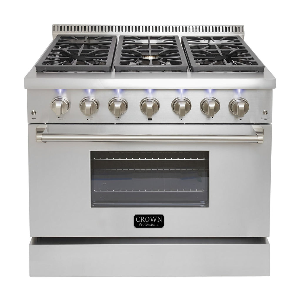 Crown Professional offers the power and performance of a premium professional appliance at a practical price. The 36 inches Crown Professional Dual Fuel Gas Range is a stainless-steel machine that is designed with professional features and functionality. This powerful dual fuel gas range has 6 burners including three 18,000 BTU burner, two 15,000 BTU dual burner with simmer and one 12,000 BTU burners giving you the flexible cooktop you’ve been dreaming about.