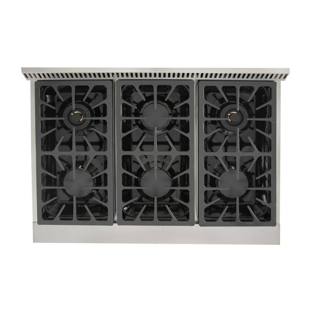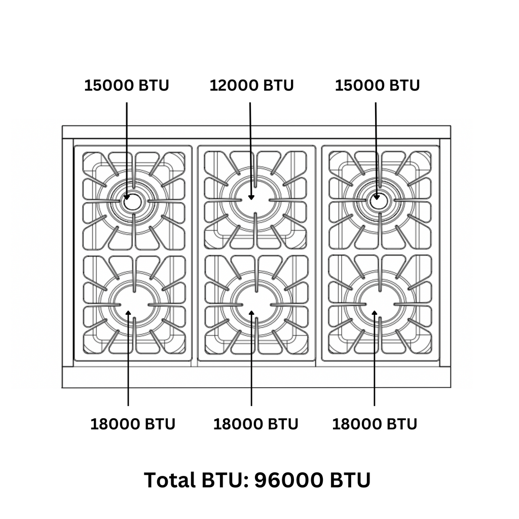 - 6 burner dual fuel gas range includes three 18,000 BTU burner, two 15,000 BTU dual burner with simmer and one 12,000 BTU burners