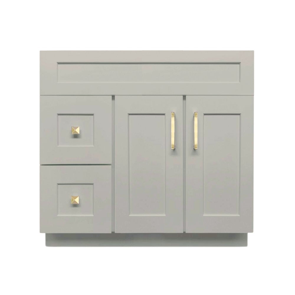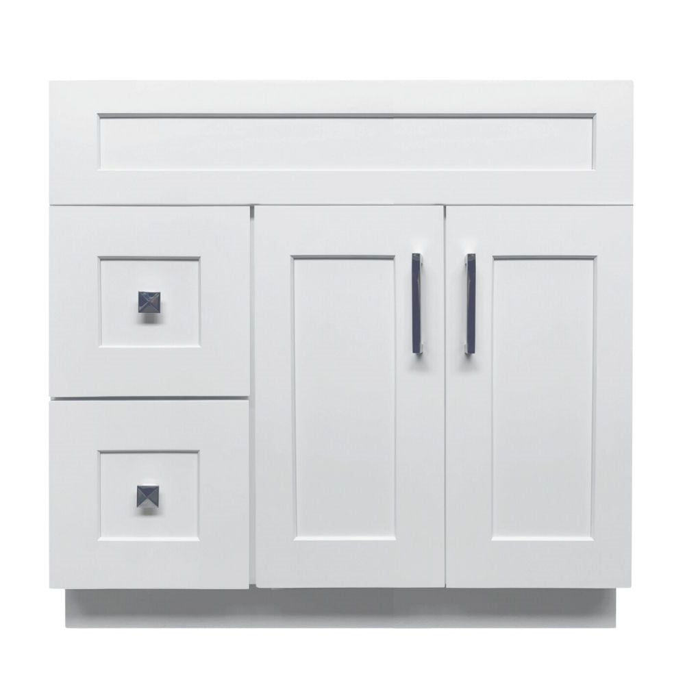 The 36 inch Solid Wood Bathroom Vanity features simple removable doors and drawers for easy inside cleaning. ‘L’ Bracket reinforces cabinets for heavy granite, marble, or other stone tops. Lot of space inside the cabinets to fit in all of your necessary items. Easy assembly and plumbing installation.