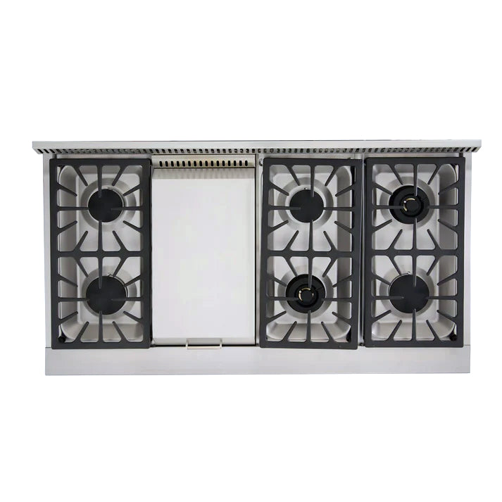 48" Crown Professional style gas range top with 6 sealed burners. This gas range top features quality control knobs, black porcelain drip pan and heavy duty flat continuous cast-iron cooking grates for easy movement of large cookware.