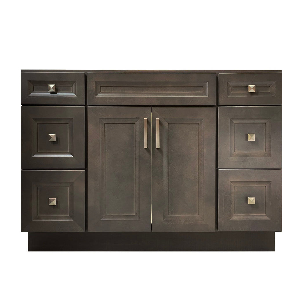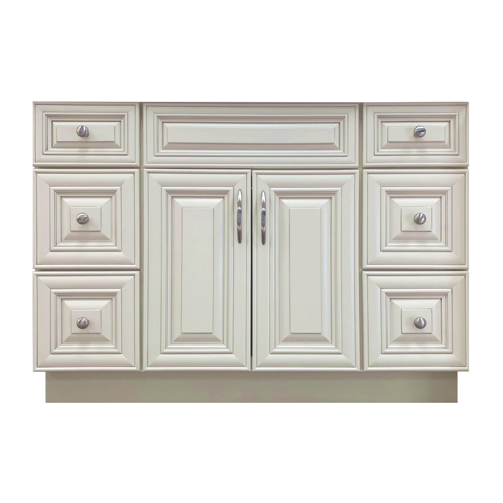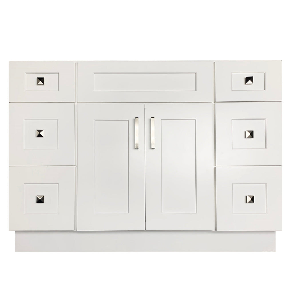 The 48 inch Solid Wood Bathroom Vanity features simple removable doors and drawers for easy inside cleaning. ‘L’ Bracket reinforces cabinets for heavy granite, marble, or other stone tops. Lot of space inside the cabinets to fit in all of your necessary items. This 48 inch solid wood bathroom vanity is easy to assemble and install for plumbing.
