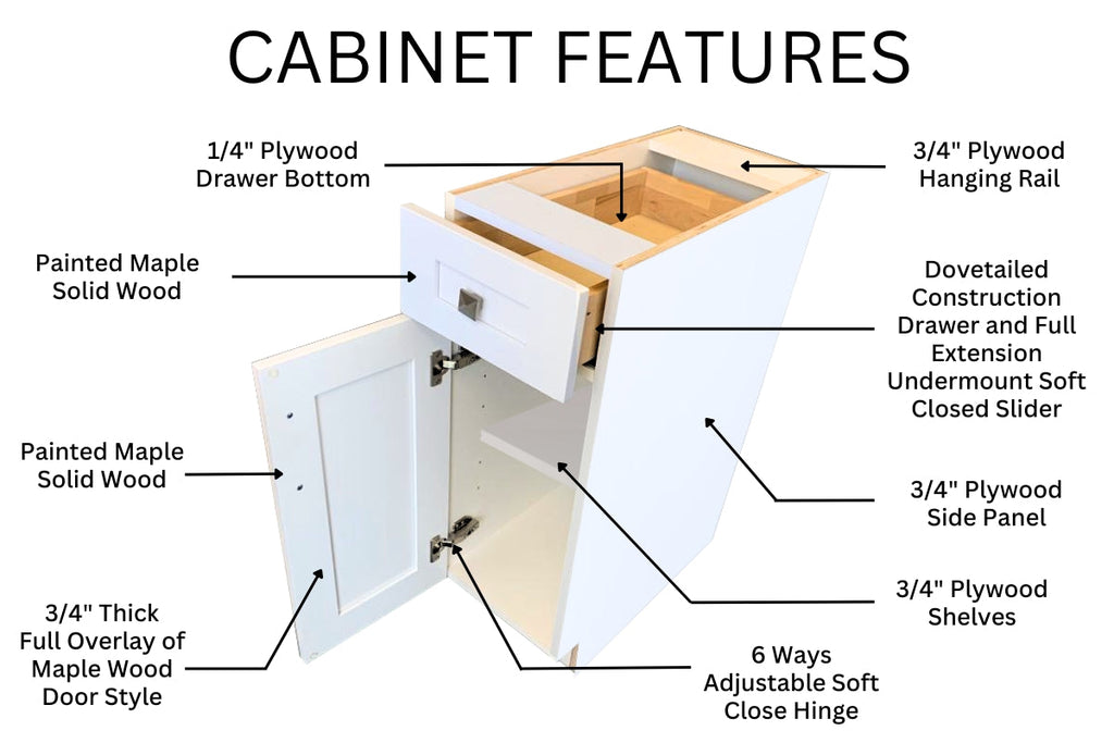 Hardware: Six-way adjustable concealed hinges with soft-close mechanism & Full extension soft-close under-mount drawer slides