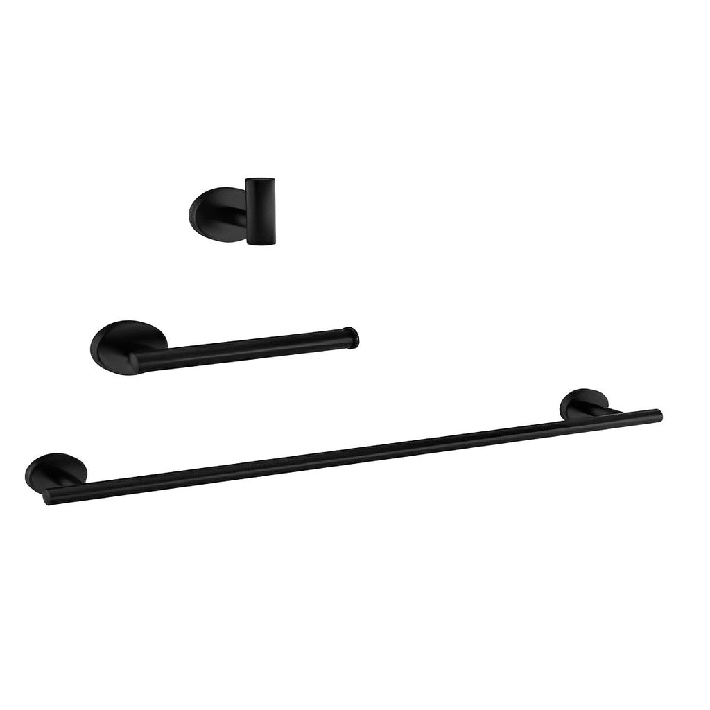 Add modern and trendy accents to your bathroom with this set of 3 matte black bathroom accessories. Including a 24-inch towel bar, a hook and a toilet paper holder with a decorative plate, you'll have everything you need to organize your bathroom in style. Featuring chic curved lines, this wall-mount set is a great choice to complete your bathroom's décor!