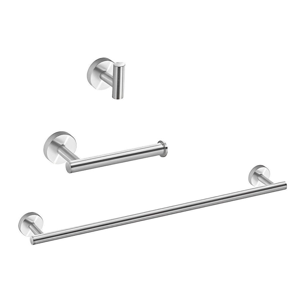 Kill three birds with one stone by opting for this bathroom accessory kit! Included are a 24” towel bar, a hook, and a toilet paper holder. These three accessories have a matching brushed nickel finish that will bring an industrial touch to your bathroom on top of being very useful.