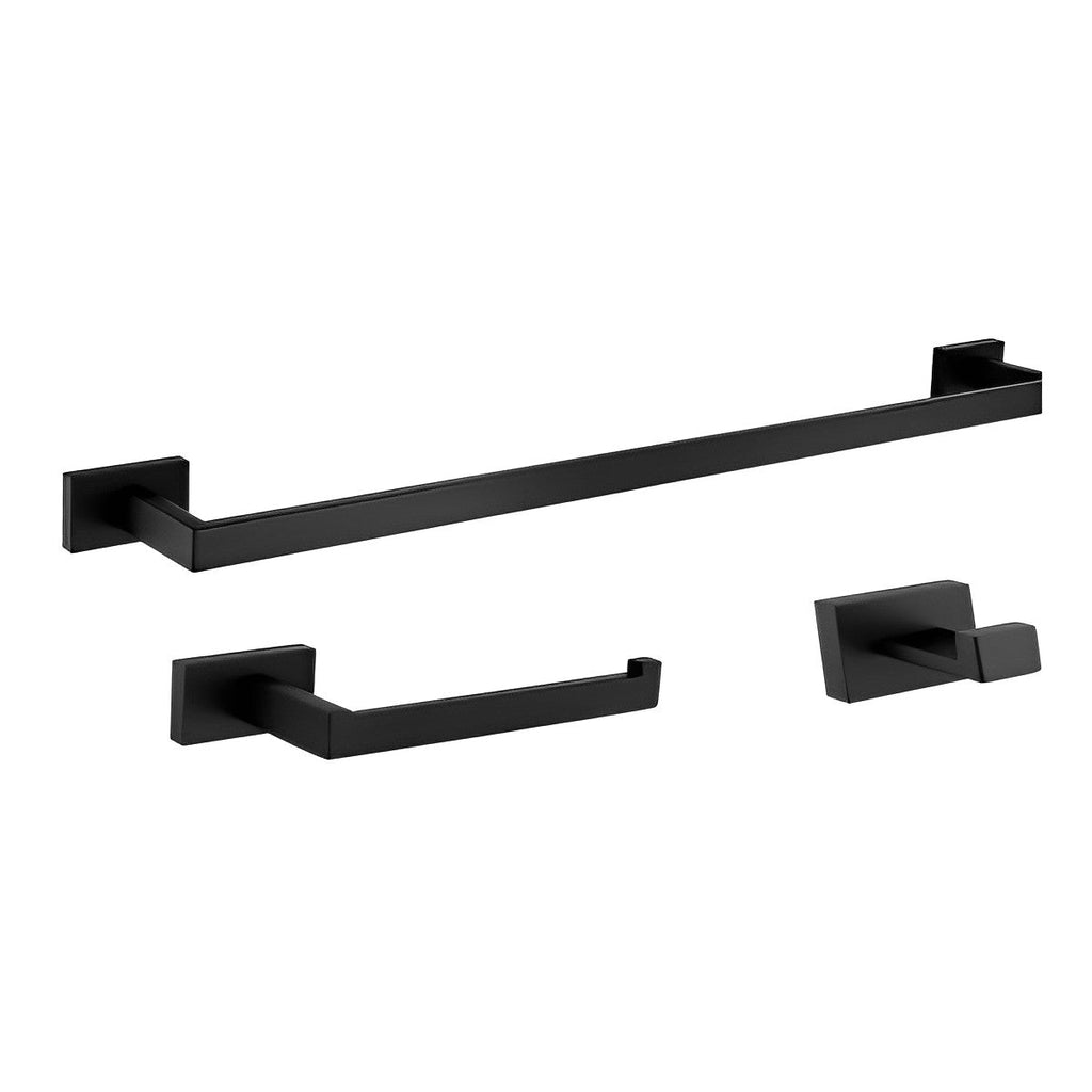 Add character to your bathroom with this rectangular matte black accessory set, including 3 items: a 24-inch towel bar, a wall hook, and a toilet paper holder. Trendy and modern, this wall-mount accessory kit offers everything you need to organize your bathroom in style.