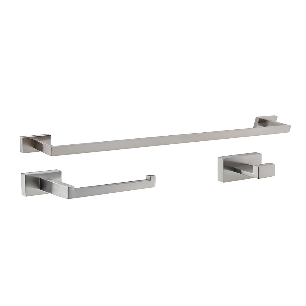 Add character and functionality to your bathroom with this set of decorative accessories including three essential items: a toilet paper holder, a wall hook and a 24-inch towel bar. These three accessories have a matching brushed nickel finish that will bring an industrial touch to your bathroom on top of being very useful.