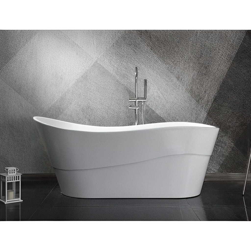 Turn your bathroom into a peaceful oasis with this unique 67-inch freestanding bathtub. Characterized by its curved shape recalling the gentle movement of the waves, it will become the main element of your bathroom! Make yourself comfortable for a relaxing bath thanks to the high backrest, its sloped sides and its oval shape that will embrace your body. Take your time to relax, as its depth allows you to keep your whole body warm. Made of fiberglass-reinforced acrylic, the tub's glossy white finish is durable and easy to clean. Combine it with a freestanding faucet or install a roman bath faucet on the end. Including the overflow and push-button drain, just add the faucet of your choice to complete it all!