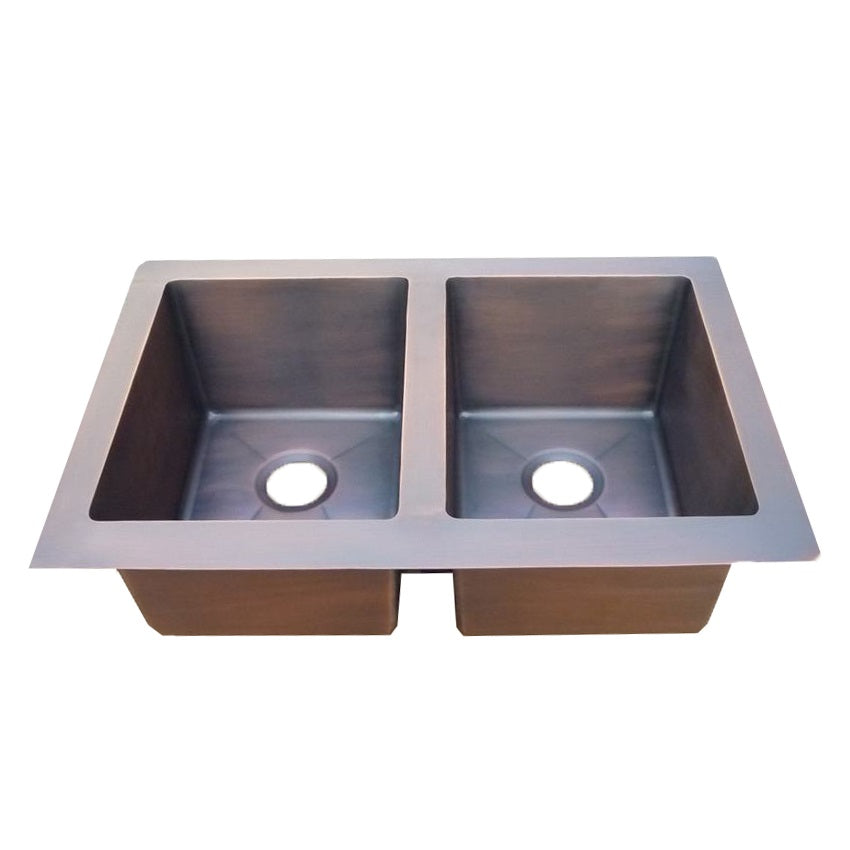 Patina finish: CoffeeSurface finish: Hand HammeredDrain opening: 3.5"Thickness: 16 Gauge/1.5 mmSize: 33" x 22" x 10" Bowl: 13.5" x 17.5" x 10"