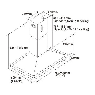 The four levels of exhaust power allow the user to suit different styles of cooking, reduce noise, and improve the efficiency of energy use. Telescopic flue accommodates 8 ft to 9 ft ceilings