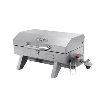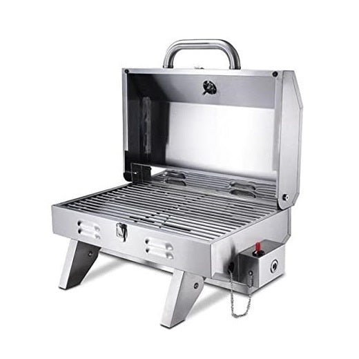 The Portable BBQ Grill and Grid are made with high-quality 430 Stainless Steel. Features a U-Shaped Burner of 12000 BTU with a flame tamer. Includes Lid latch for storage and transport with foldable legs.