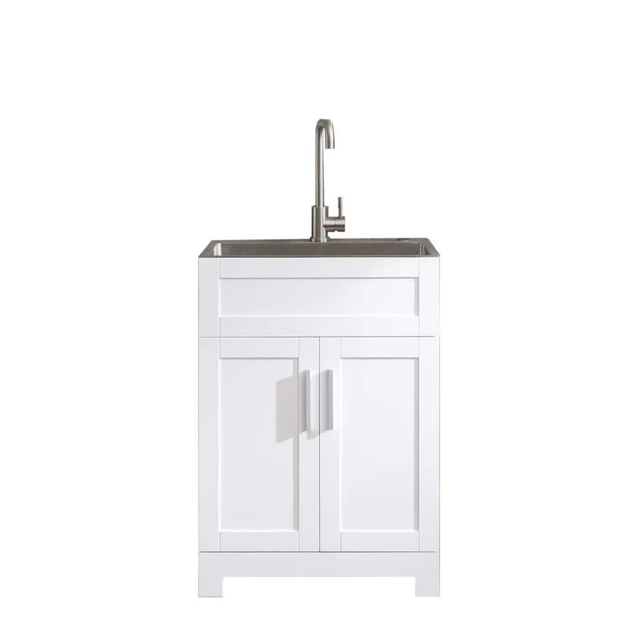 CROWN White Laundry Tub Cabinet combines practicality and style, offering ample storage with a stunning stainless steel sink and faucet. Crafted from durable MDF with an eco-friendly white finish, this compact unit is perfect for small settings, bringing efficient use of space to any bathroom or laundry room.