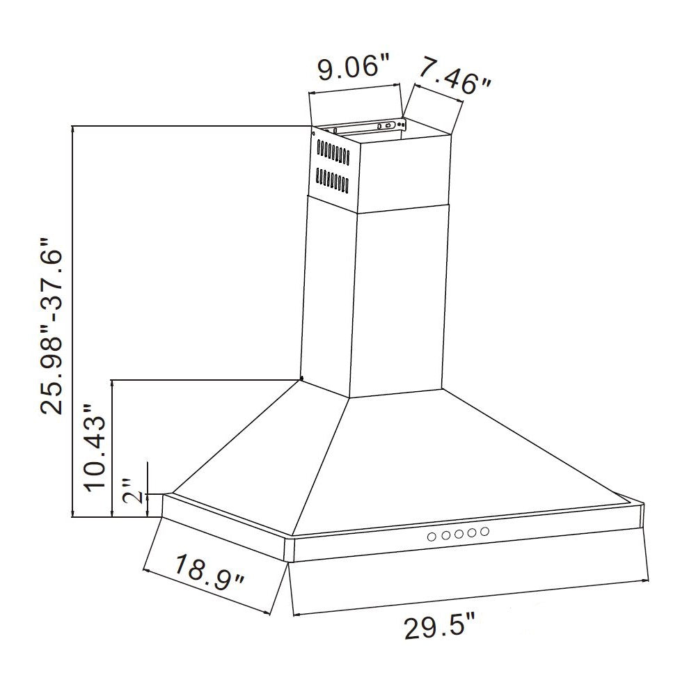 The Wall Mount Range Hood comes with 5 years warranty on the motor and 1 year on other parts. Range Hood Dimension are 29.80"L X 19"W X 37"H