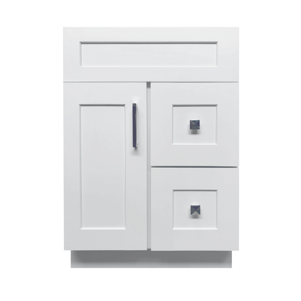 Crown 24 inch Solid Wood Bathroom Vanity Single Sink is made with solid maple wood. All the colors are vibrant and eye-catching. Only high-quality materials are used to make all of our vanities. Soft-closing doors and drawers prevent scratches and cracks. The door is on the left side. Includes countertop and sink.