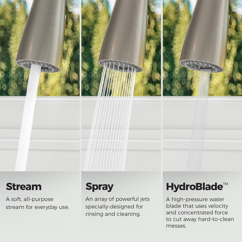 - Pull down sprayer: hydroblade high pressure water blade uses concentrated force to clean away tough messes; select from three water settings in the palm of your hand; wipe clean nozzles let you wipe away mineral deposits with the swipe of a finger