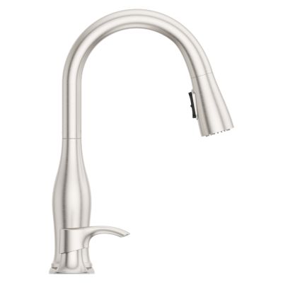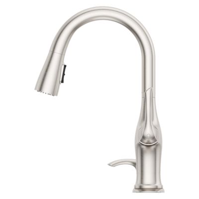 - Kitchen faucet with pull down sprayer: advanced spray head docking system; elegant forward handle design underscores ergonomic function and helps where space behind the faucet is limited; includes decorative deck plate